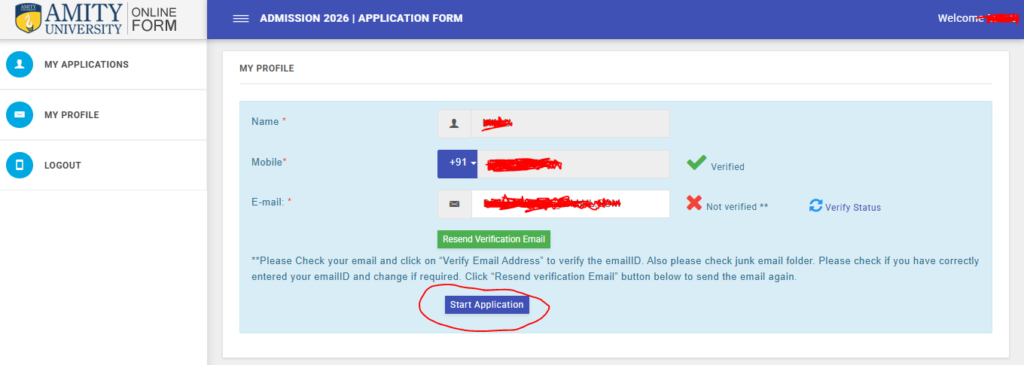 Step 3: After signing up, you will be redirected to the “Applications Form” section. Review and confirm your details, then proceed by clicking “Start Application.”
