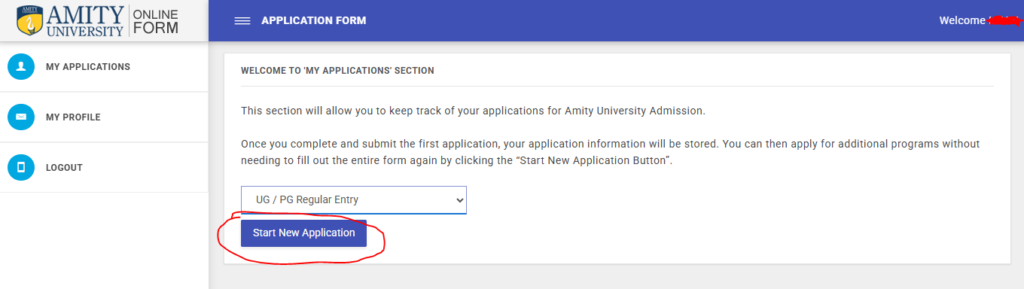 Step 4: On the next page, you can see the below section. Select your desired course from the dropdown menu and click on “Start New Application.”