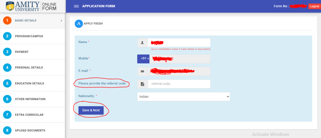 - Fill the Form: Enter the alphanumeric code in the “Referral/AIC Code” box on the Amity application portal.